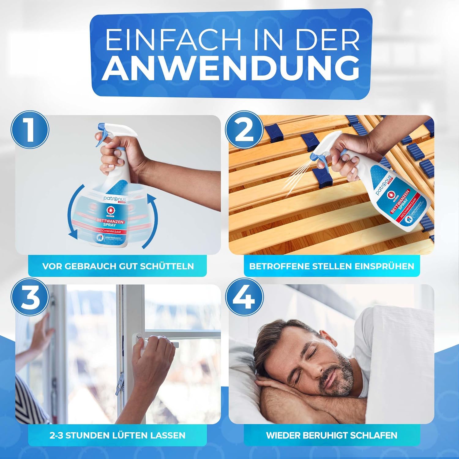 Das Bettwanzen-Spray kannst Du bedenkenlos direkt bei einem Verdacht auf einen Befall mit Bettwanzen auf die betroffenen Stellen aufsprühen. Ob Matratze, Lattenroste oder Teppiche – verteile das Mittel nach Anweisung großflächig. Selbst in einem Haushalt mit Haustieren kannst Du das Spray problemlos verwenden, um Bettwanzen zu bekämpfen. Nach der Anwendung sollte der Raum nur ausgelüftet werden, bevor Du Deine Fellnase wieder hineinlässt. Nach dem Aufsprühen beginnt das Bettwanzen-Spray umgehend seine Wirkung zu entfalten. Frei von schädlichen Wirkstoffen bekämpft das Spray die Parasiten. Bei einem sehr starken Befall kann der Power Fogger als Spray gegen Bettwanzen zum Einsatz kommen. Doch auch der Einsatz eines professionellen Schädlingsbekämpfers ist dann ratsam.