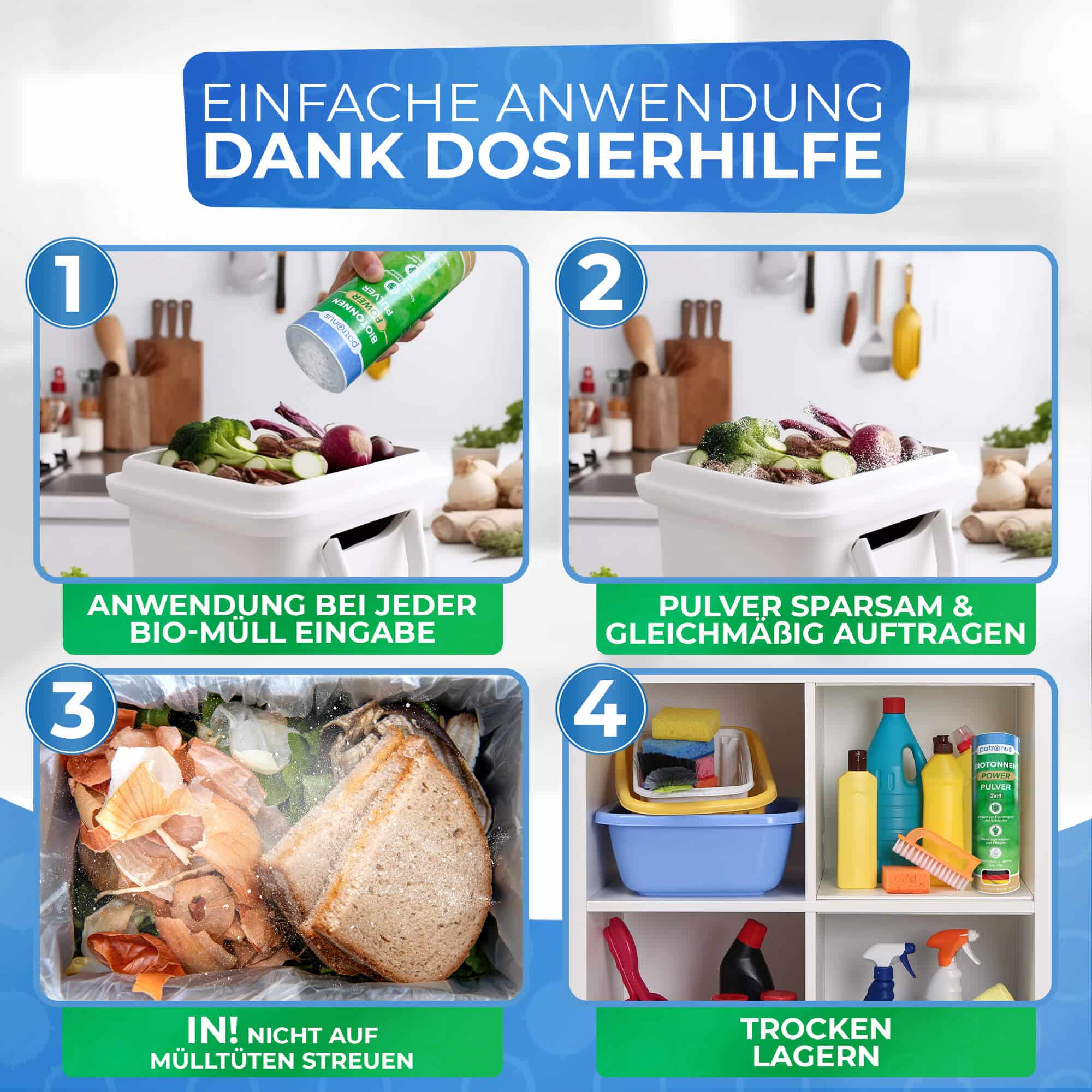 Die Anwendung ist denkbar einfach: Streut eine dünne Schicht Biotonnenpulver über die Abfälle, nachdem ihr sie in die Tonne gegeben habt. Wiederholt dies bei jeder neuen Schicht Müll. Ich empfehle, besonders in den heißen Sommermonaten oder bei sehr feuchtem Abfall, etwas großzügiger zu sein.