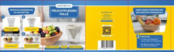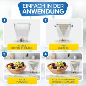 3. Schritt: Die Obstfliegen-Falle alle 3-4 Tage reinigen und Köder erneuern, um Langzeitschutz gegen Fruchtfliegen zu genießen. Wichtig: Weitere Tipps sind auf der Verpackung zu finden.