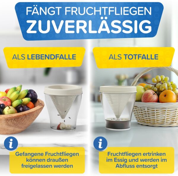 Ja! Wenn du ein Obststück als natürlichen Köder verwendest, fliegen die Obstfliegen in die Falle und kommen nicht mehr alleine heraus. Du kannst sie dann z.B. draußen freilassen.