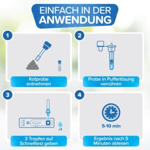 Wichtig Hinweis: Zu viel Kot oder umliegende Verschmutzungen können den Test ungültig machen. Außerdem bitte darauf achten, dass die Kotproben beim Test eine Raumtemperatur von 15-30 Grad haben. Genaustens auf die Schritte der weiteren Anleitung (im Produkt beiligend) achten.