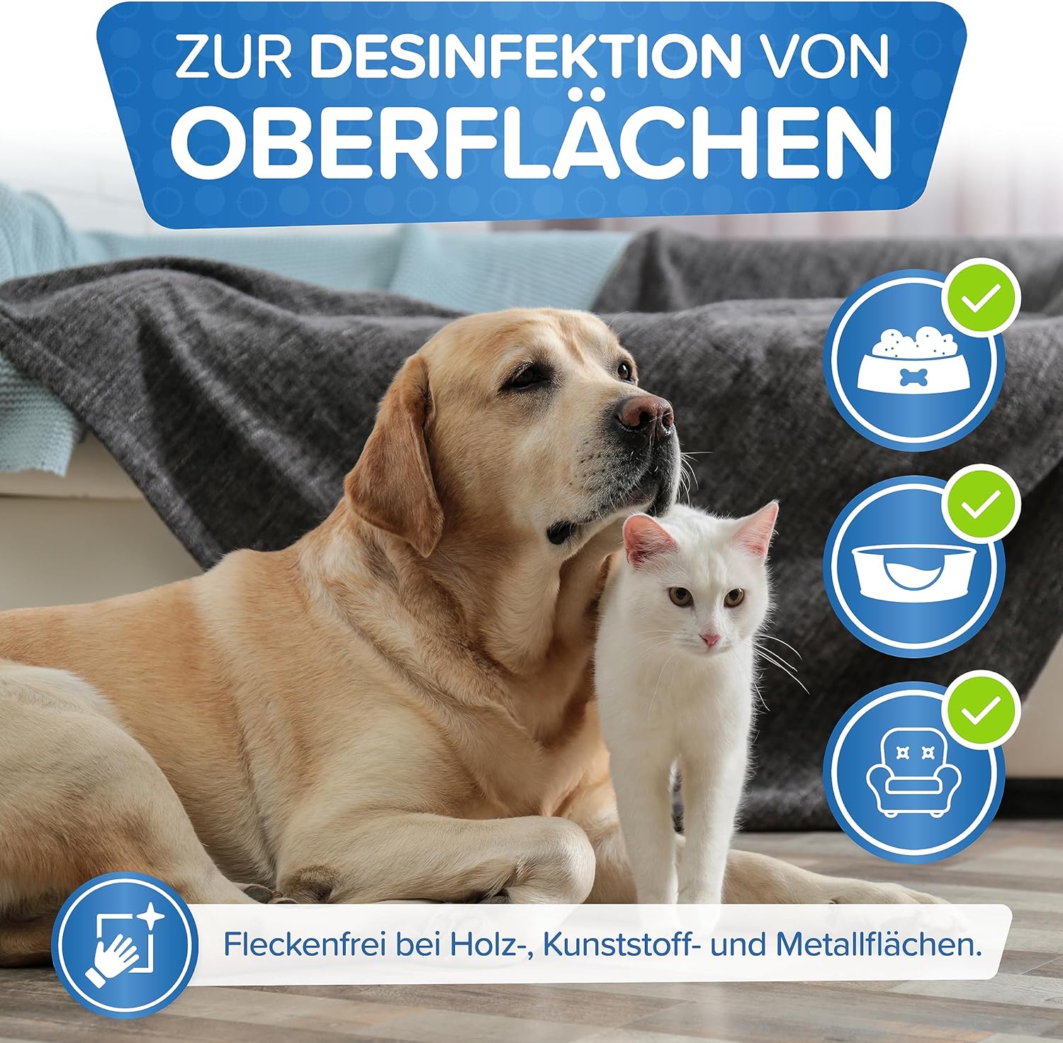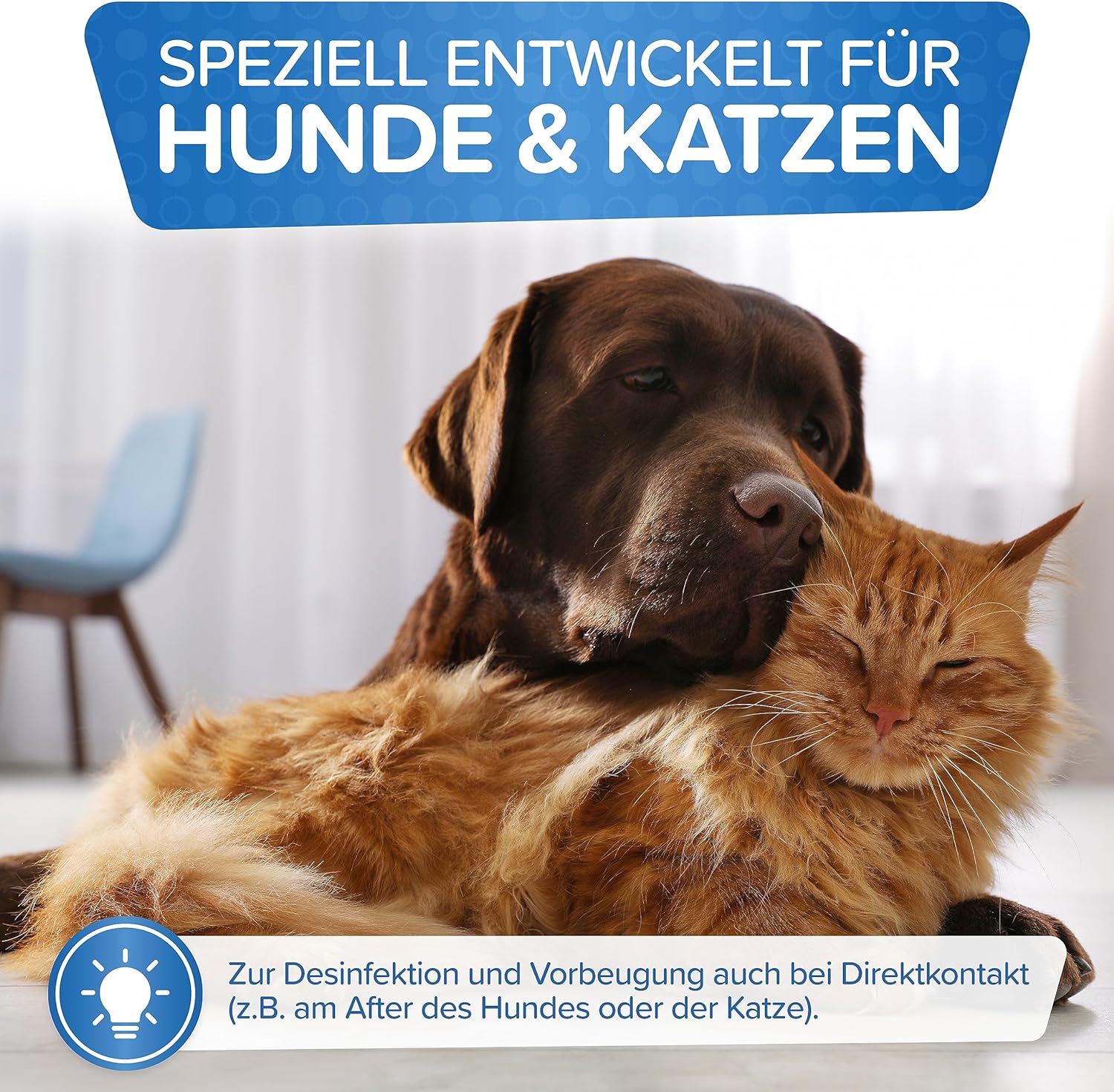 2. Schritt: Aufenthaltsorte, Textilien & Pfoten der Tiere aus ca. 30 cm Entfernung besprühen. Auch der Anus des Hundes kann besprüht werden.
