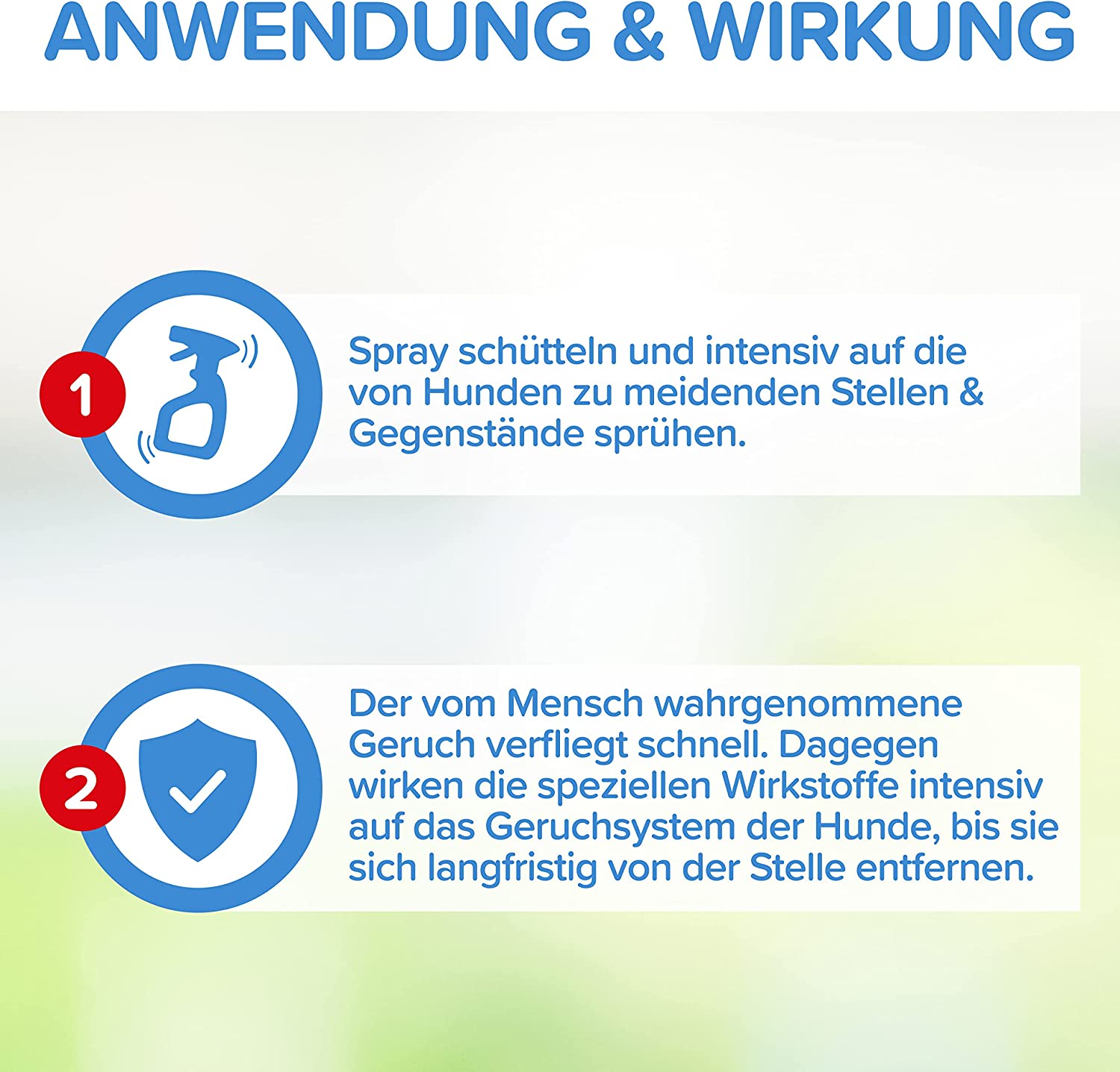 3. Schritt: In hartnäckigen Fällen die Anwendung alle 2-3 Tage wiederholen, bis die Hunde sich langfristig fernhalten Wichtig Info: Der vom Mensch wahrgenommene Geruch verfliegt schnell. Dagegen wirken die speziellen Wirkstoffe intensiv auf das Geruchsystem der Hunde, bis sie sich langfristig von der Stelle entfernen.