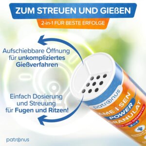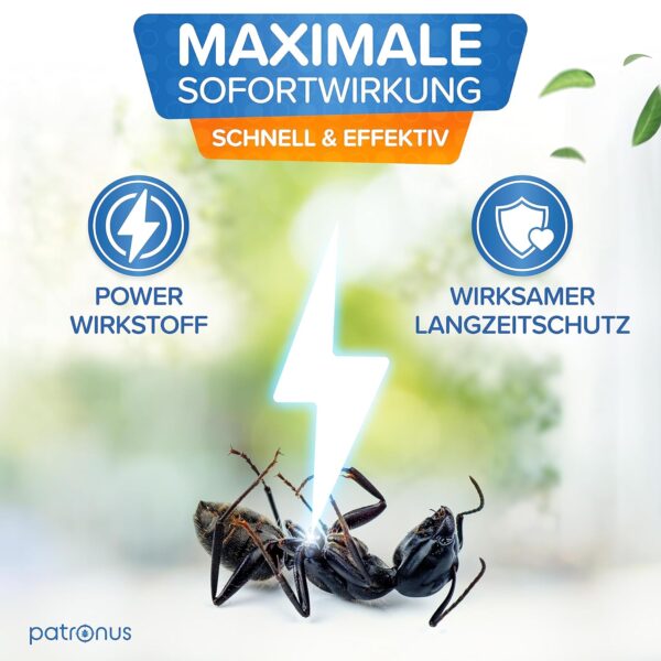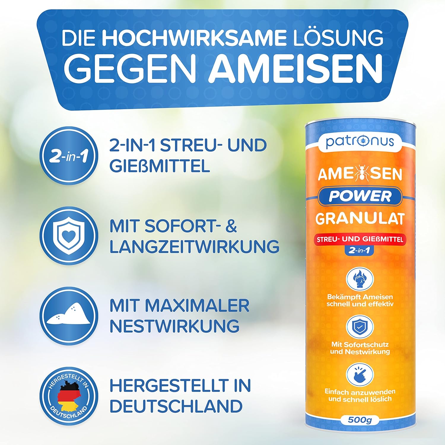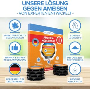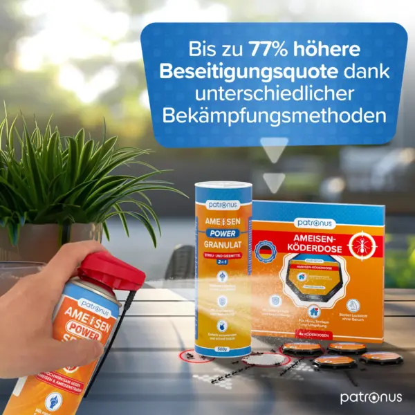 Bist du es leid, Ameisen im Garten zu haben? Mit dem Patronus Ameisen Outdoor-Komplettpaket hast du die ultimative Waffe gegen diese lästigen Plagegeister. Unser kraftvolles Power-Spray erfasst selbst die dunkelsten Verstecke. Die Ameisen-Köderdosen locken sie an. Schnelle und effektive Bekämpfung garantiert! Detaillierte Anleitungen zu den Produkten findest du direkt auf der Etikettenrückseite deines Patronus Produkts. Bestelle jetzt und befreie deinen Garten von Ameisen.