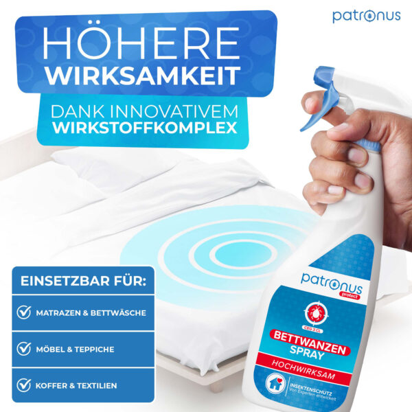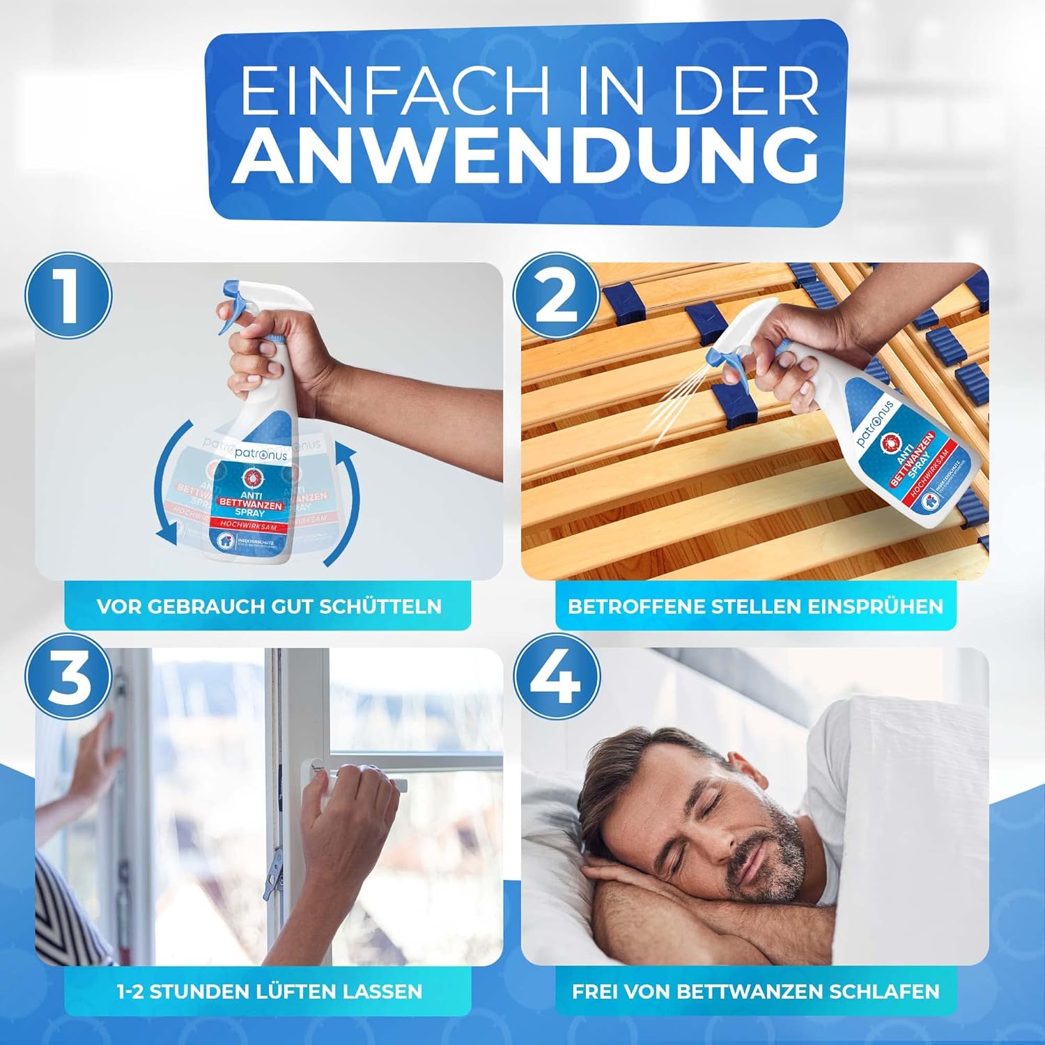 Detailierte Anleitungen zu den Produkten findest du direkt auf der Etikettenrückseite deines Patronus Produkts. Bestelle jetzt und befreie dein Zuhause von Bettwanzen.