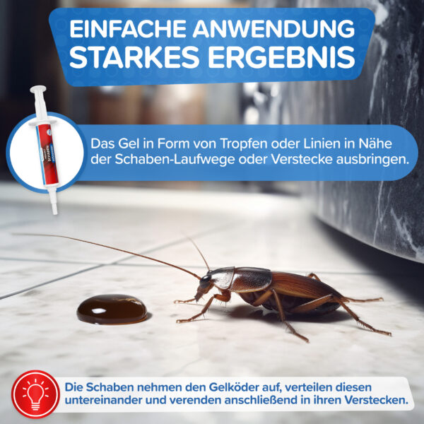 2. Schritt: Schabengel in Form von Tropfen in Nähe der Laufwege und Schlupflöcher der Schaben ausbringen & anschließend 1x die Woche kontrollieren bzw. Gel erneuern.