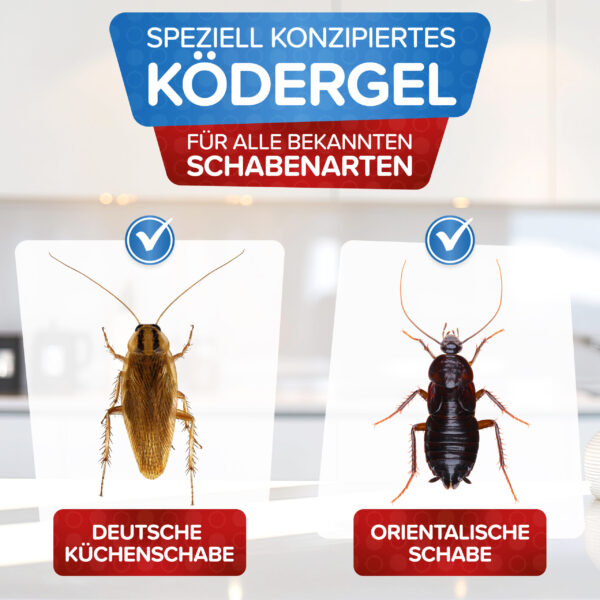 Das Ködergel wirkt gegen zahlreiche Arten von Schaben, darunter: die deutsche Schabe und die orientalische Schabe