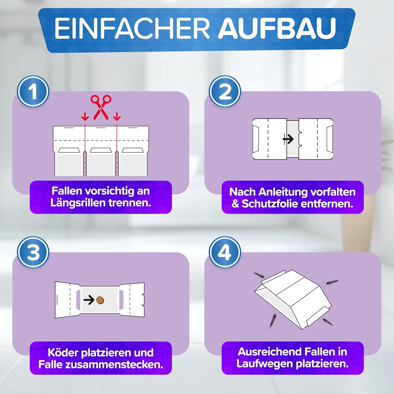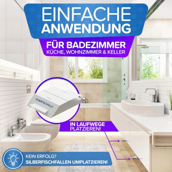 Stelle die Silberfisch-Falle einfach im Badezimmer, im Keller oder sogar in der Küche auf und warte 2 bis 3 Tage ab. Die Silberfischchen werden von einem speziellen Duftstoff in der Falle angezogen und bleiben auf der Klebefläche haften. Unkompliziert und dennoch besonders effektiv. Bei einem sehr starken Befall erzielt die Kombination aus Silberfisch-Falle und Silberfisch-Spray die schnellsten Ergebnisse.