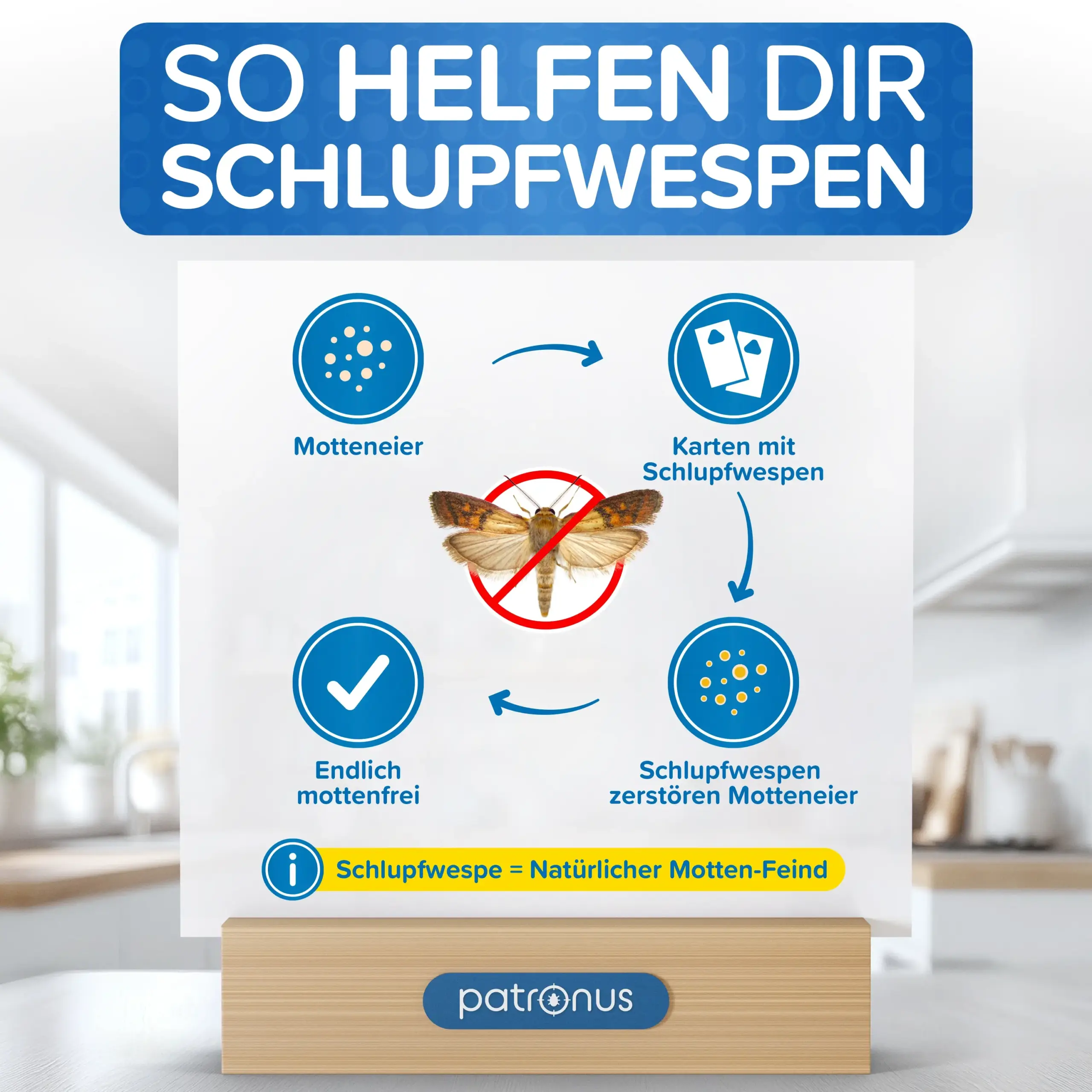 Jetzt übernehmen die winzigen Nützlinge. Schlupfwespen suchen selbstständig nach Motteneiern und zerstören sie – ganz ohne dein Zutun. Kein Sprühen, kein Warten, kein Stress.