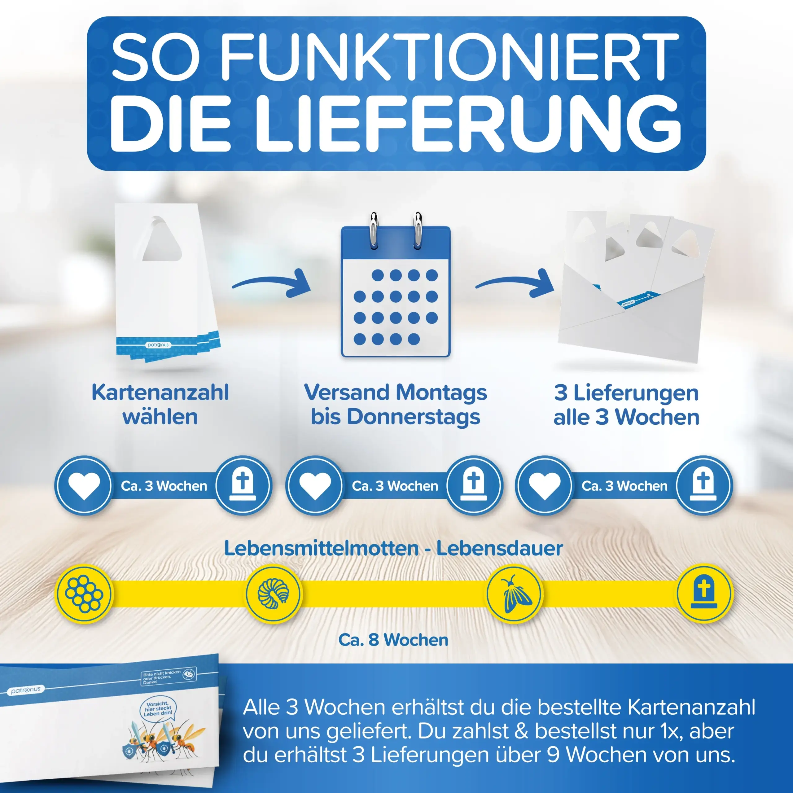 Lieferung via Abo oder Einzelpaket alle 2–3 Wochen – insgesamt 3–4 Kärtchen über 9–12 Wochen, um Mottenlebenszyklus vollständig zu unterbrechen