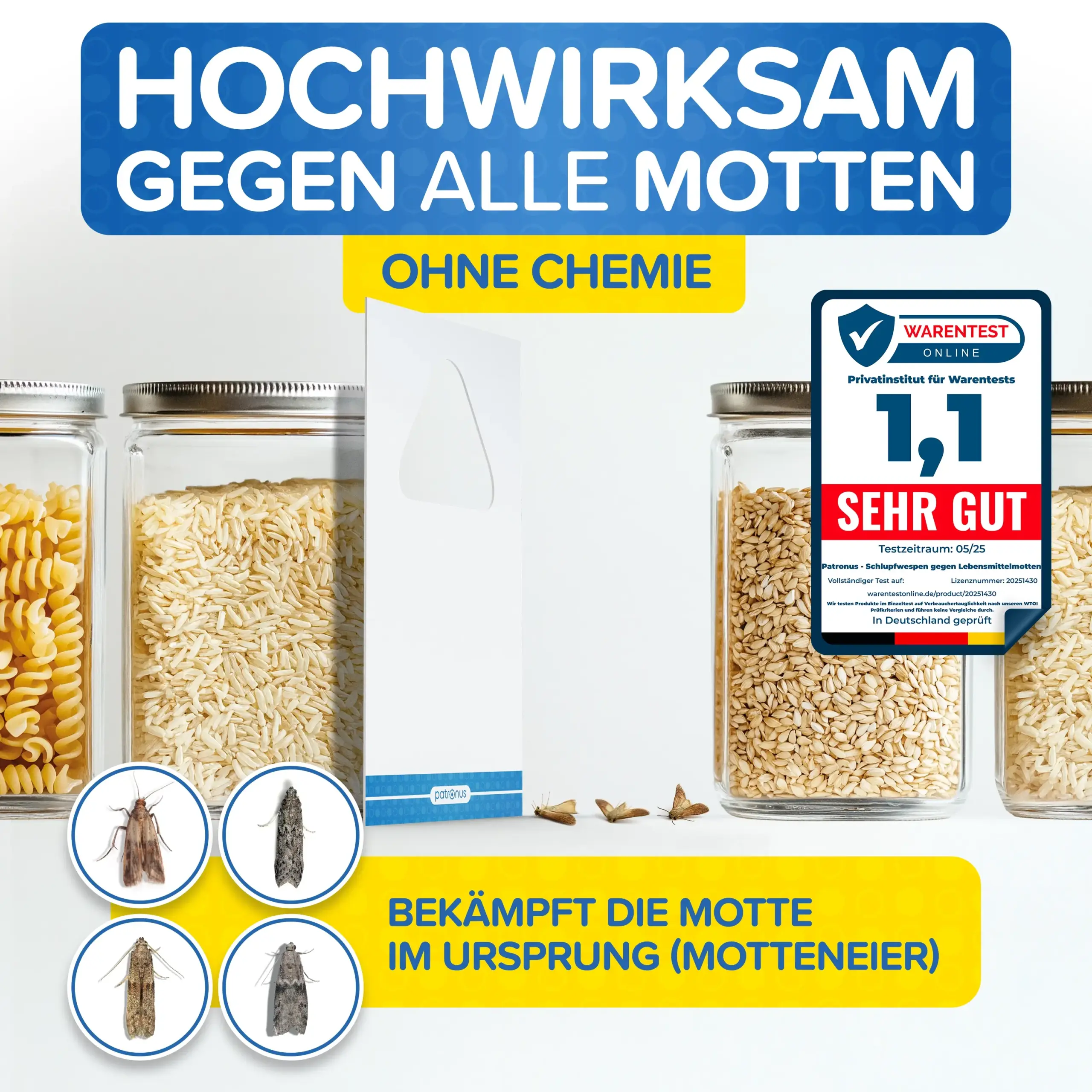 Mottenfrei in 3 Wochen – ganz ohne Chemie Mottenfrei in 3 Wochen – ganz ohne Chemie Schlupfwespen beseitigen Lebensmittelmotten nachhaltig, indem sie deren Eier unschädlich machen – 100 % biologisch & für Küche und Vorräte zugelassen