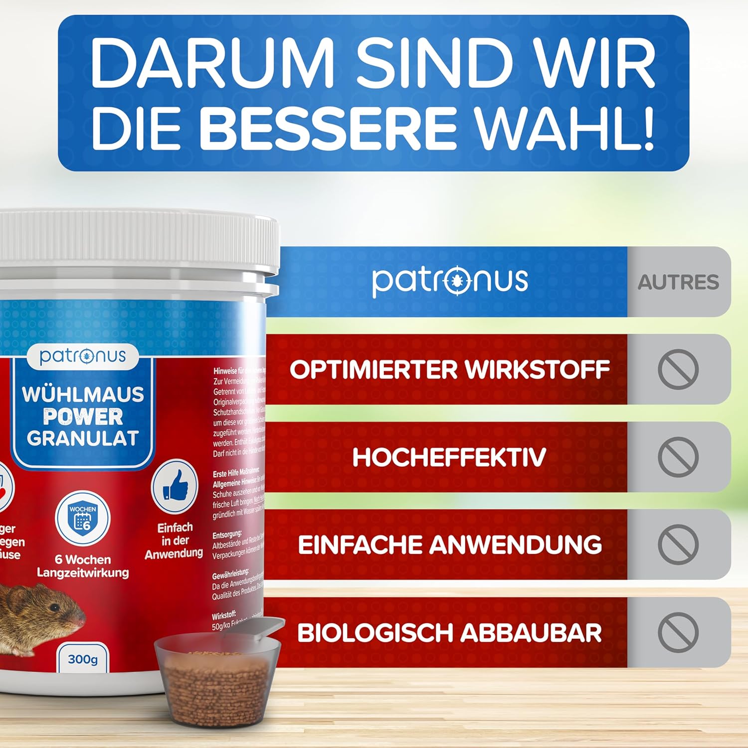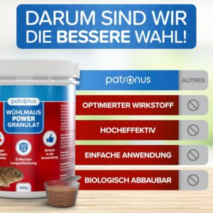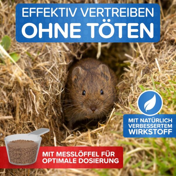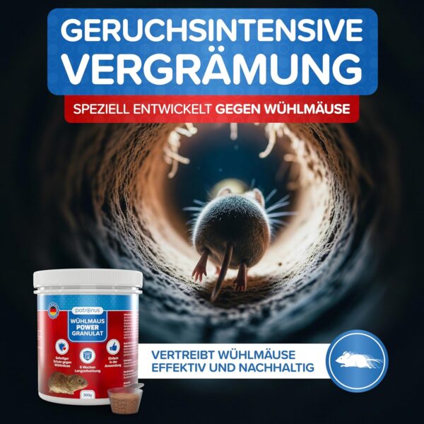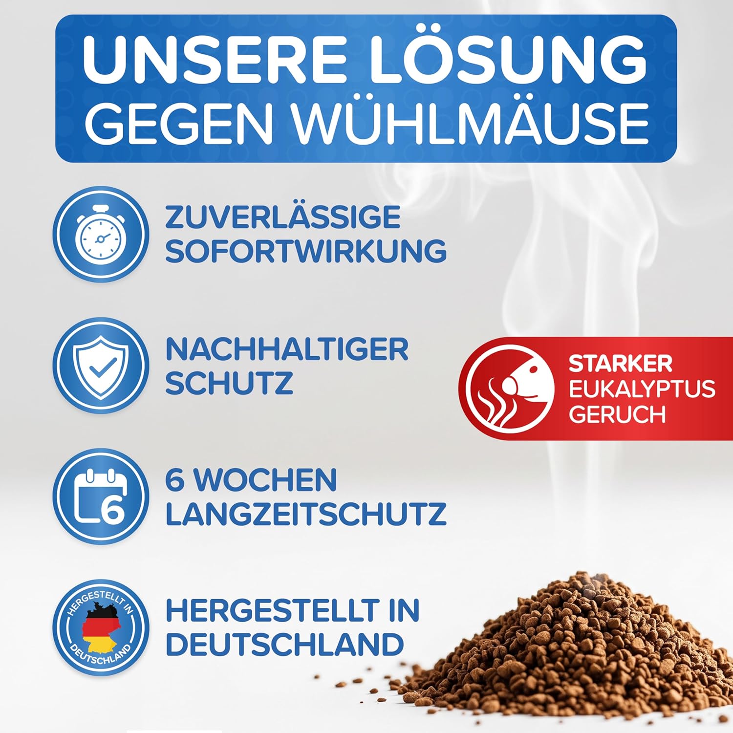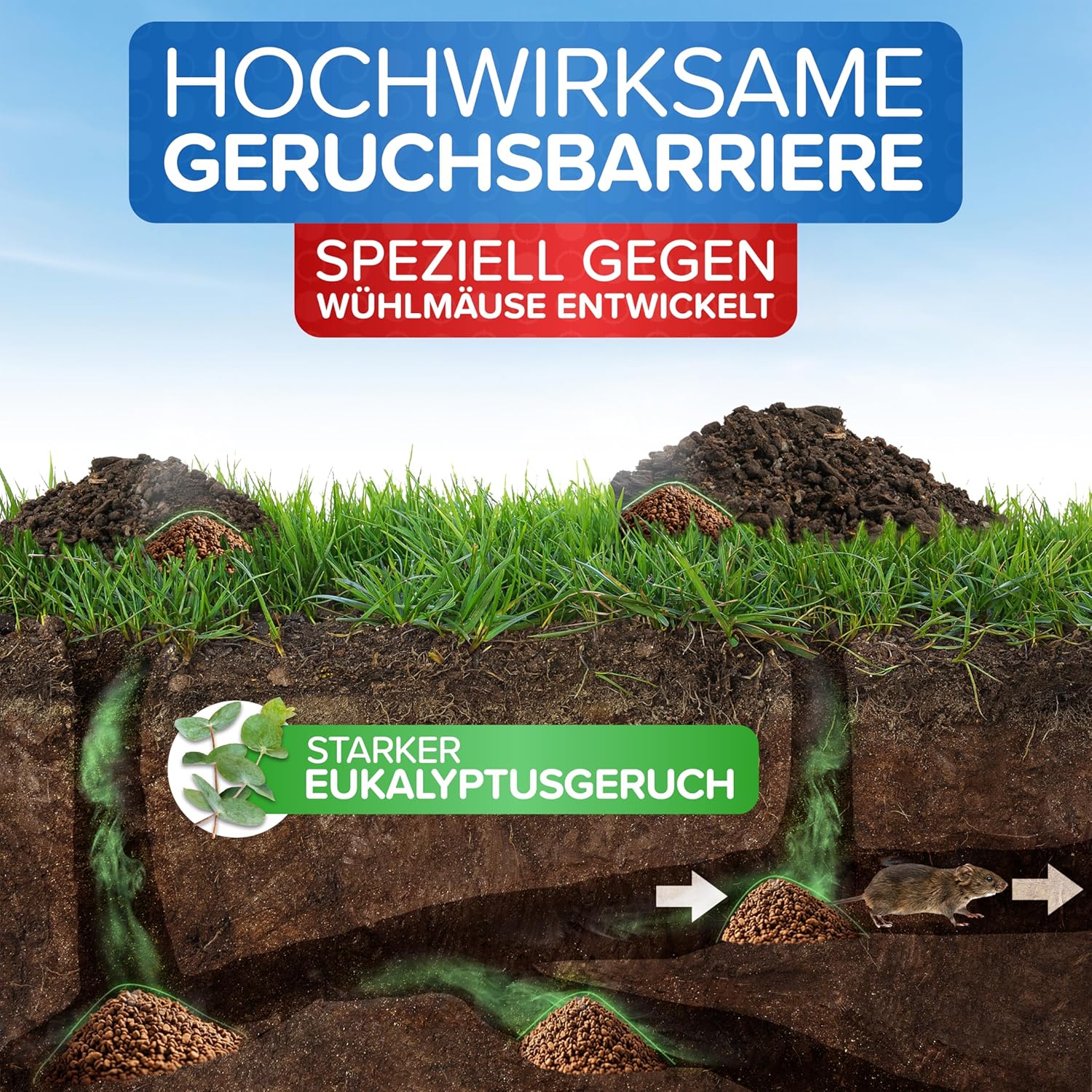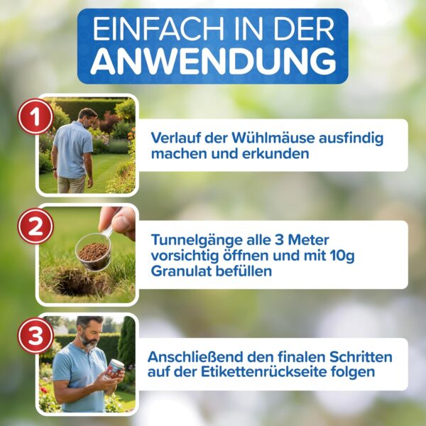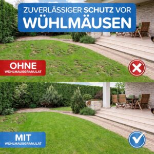 Wichtig: Bei hartnäckigen oder bereits länger andauernden Problemen sollte die Anwendung alle 2 Wochen, bis zum Ausbleiben der Wühlmäuse, wiederholt werden.